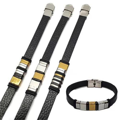 Toptan Çelik Detaylı Deri Erkek Bileklik - Maskülen ve Şık Tasarım
