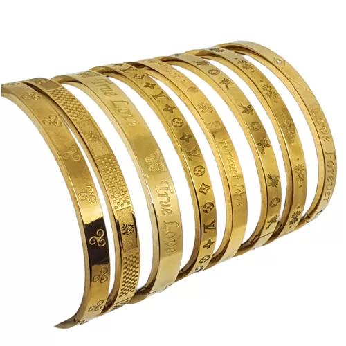 Toptan karışık desenli sarı bileklik ve kelepçe bileziklerimiz % 100 çelikten imal edilmiştir. Paslanmayan ve deriye zarar vermeyen, muhteşem bileklik ve kelepçe bilezik modellerimize göz atın.