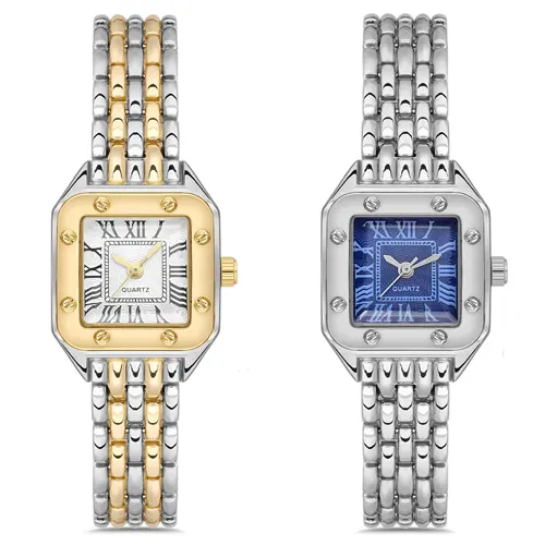 Kare formdaki kasa yapısı, köşelerde yer alan vida detaylı bezel tasarımı ve iç içe geçmiş Roma rakamlı kadran ile klasik saat estetiğini modern bir yorumla sunar. Çok parçalı metal kordon yapısı sayesinde hem dayanıklı hem de bilekte premium bir hissiyat sağlar.
