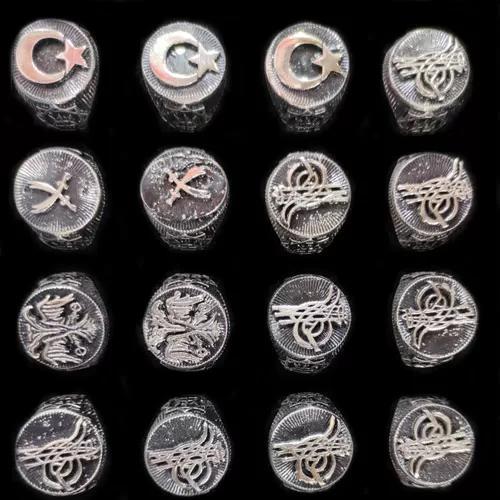 Toptan desenli eskitme erkek yüzükler ithal ürün olup, 316L kaliteli çelikten imal edilmiştir. Paket içerisinde; türk bayrağı, ayyıldız, osmanlı tuğrası gibi,