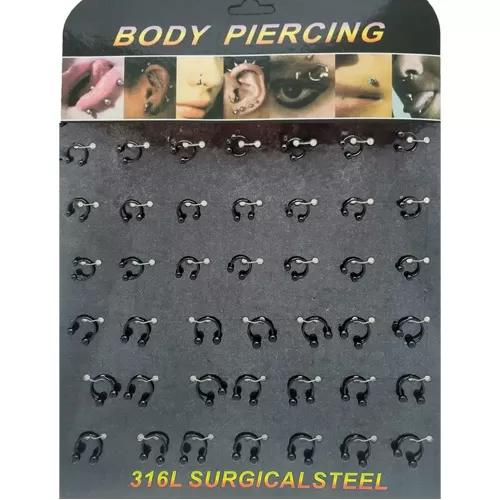 Siyah ve gümüş yarım ay çelik piercing, sade ve modern tasarımıyla vitrinlerde fark yaratır. Unisex kullanıma uygun yapısıyla geniş müşteri kitlesine hitap eder ve mağazanız için etkili bir stok seçeneği sunar.